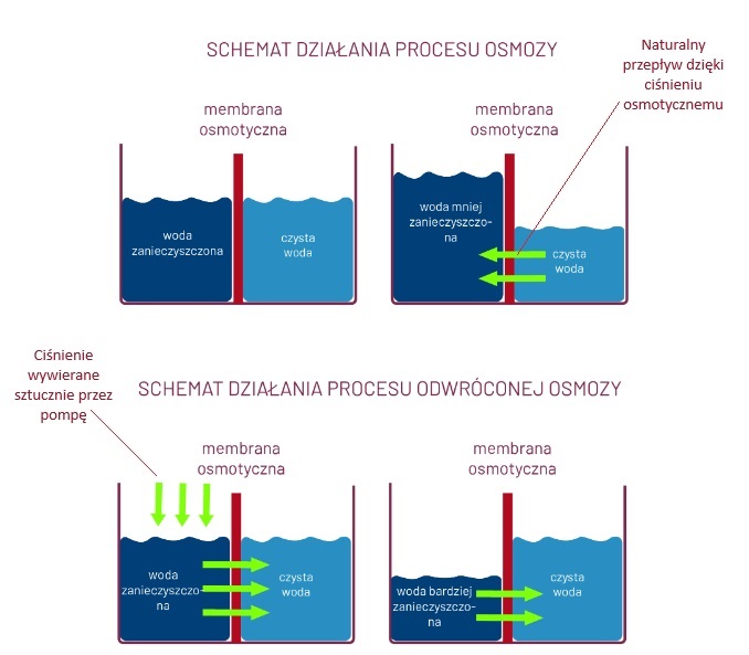 Potocznie terminem „odwrócona osmoza” opisuje się system uzdatniania wody przy użyciu procesu o tej samej nazwie. Aby najlepiej zrozumieć jak działa ten proces, należy wyobrazić sobie zbiornik, w którym znajdują się dwa różne roztwory soli przedzielone półprzepuszczalną membraną. W standardowej osmozie, woda siłami natury przechodzić będzie w kierunku roztworu o niższym stężeniu do tego o wyższym stężeniu – inaczej powiedzieć można, że woda przechodzi od czystej do brudnej, wyrównując stężenie roztworów po obu stronach membrany. Jest to zjawisko spowodowane działaniem ciśnienia osmotycznego. W odwrotnej osmozie, wysokociśnieniową pompą wymusza się przechodzenie wody w kierunku odwrotnym – z brudnej do czystej, gdzie na membranie zatrzymuje się sól, chlor, metale ciężkie, związki organiczne oraz bakterie. Zatem membrana działa jak sitko zatrzymujące zanieczyszczenia, pozostawiając jednocześnie czystą wodę po drugiej jej stronie.