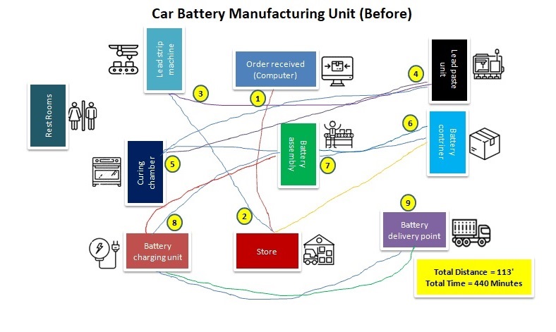 Poniżej przykład diagramu spaghetti stanowiska produkcji baterii samochodowych.